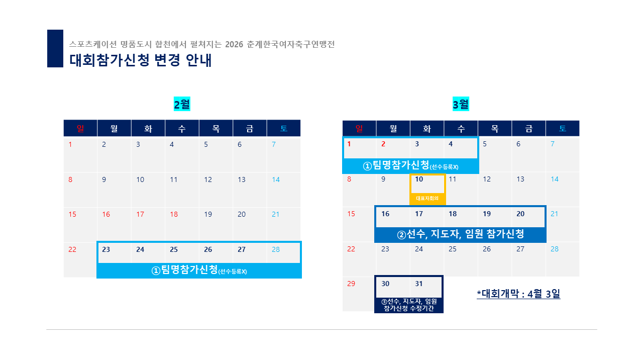 - 대회명 : 스포츠케이션 명품도시 합천에서 펼쳐지는 2026 춘계한국여자축구연맹전