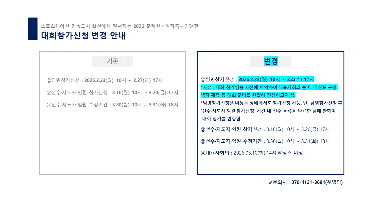 스포츠케이션 명품도시 합천에서 펼쳐지는 2026 춘계한국여자축구연맹전 개최 알림의 건(*참가신청기간 변경)