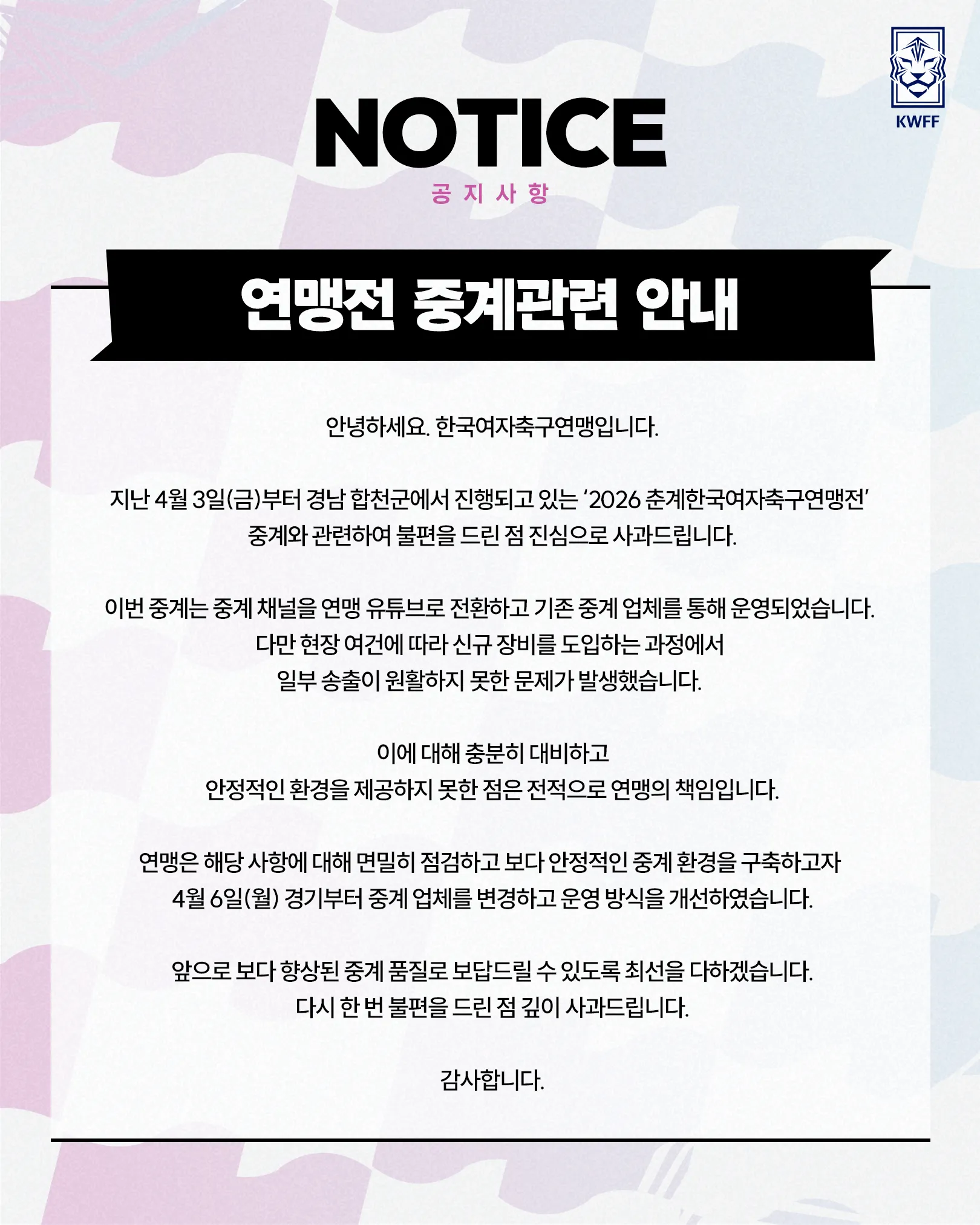 지난 4월 3일(금)부터 경남 합천군에서 진행되고 있는 ‘2026 춘계한국여자축구연맹전’ 중계와 관련하여 불편을 드린 점 진심으로 사과드립니다.