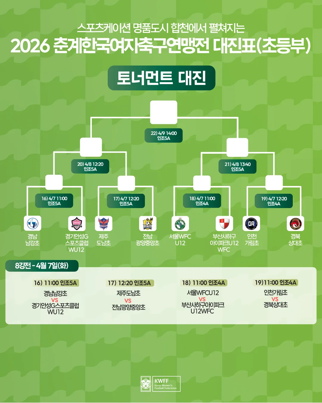 스포츠케이션 명품도시 합천에서 펼쳐지는 2026 춘계한국여자축구연맹전 초등부 본선 토너먼트 대진표(8강) 안내